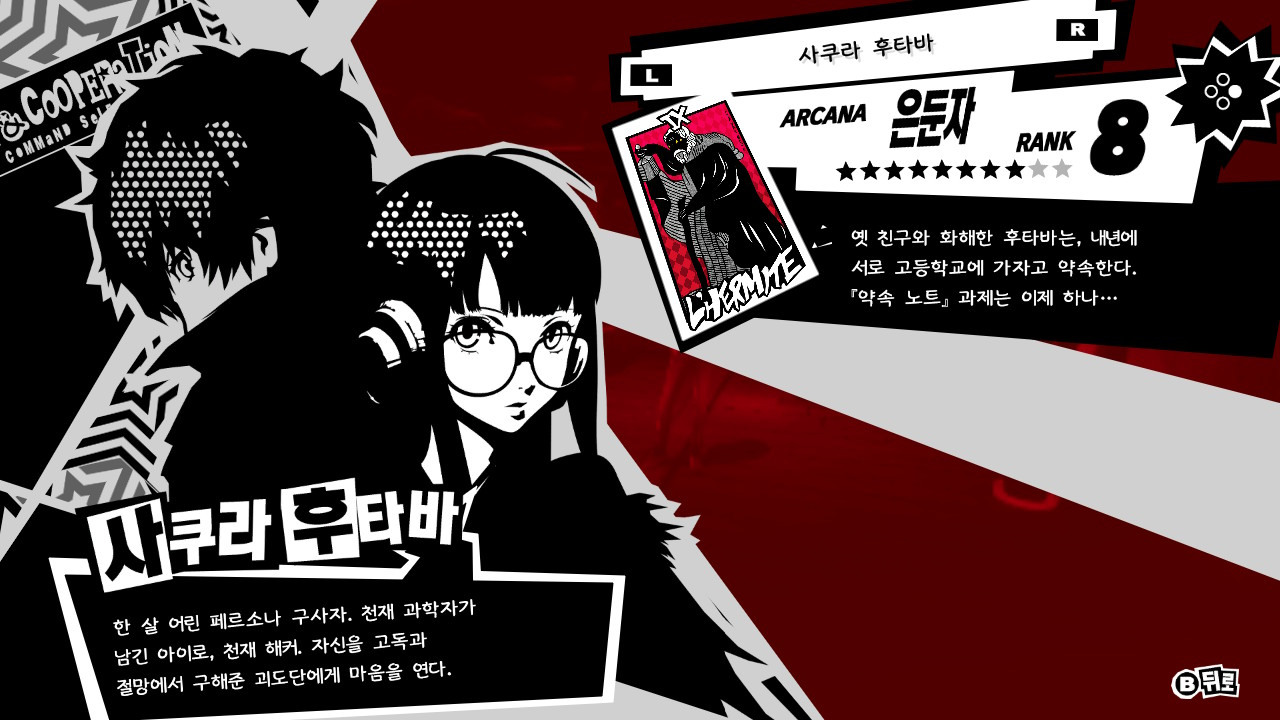 캐릭터 ‘후타바’는 방에 틀어박혀 지내는 천재 해커이자, 사회성이 부족하지만 특정 분야에서는 압도적인 능력을 보이고, 4차원 성격에 게임을 좋아한다는 설정을 지니고 있습니다. 이는 ‘페르소나 5’라는 100시간짜리 패키지 게임을 수 만원을 주고 플레이할 방구석 플레이어들에게 유사성 매력효과를 불러일으키기에 충분한 설정이라고 생각합니다. 또한 개발사가 팰리스 하나를 통째로 할애해서 밀어주는 캐릭터인 만큼 외형이나 보이스도 다른 캐릭터들에 비해 신경을 쓴 듯 하고요.
