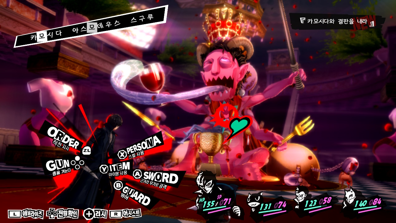 그러나 머지 않아 게임을 접게 됩니다. 날짜 시스템, 주인공의 능력치(지성, 매력 등), 관계 시스템, 페르소나, 귀중품, 잠입 도구, 전투 보조 아이템, 선물용 아이템 등 관리해야 할 요소 및 정보량이 너무 많았고, 세상 못생긴 셰도 디자인, 우중충한 팰리스 분위기, 불쾌한 캐릭터 얼굴과 팰리스 컨셉, 게임 도중 반복적으로 취조실이나 꿈속 세계로 끌려가는 연출, 새로운 지역이 해금될 때마다 기하급수적으로 늘어나는 정보량 등 게임을 접고 싶게 만드는 요소가 너무 많았습니다.
