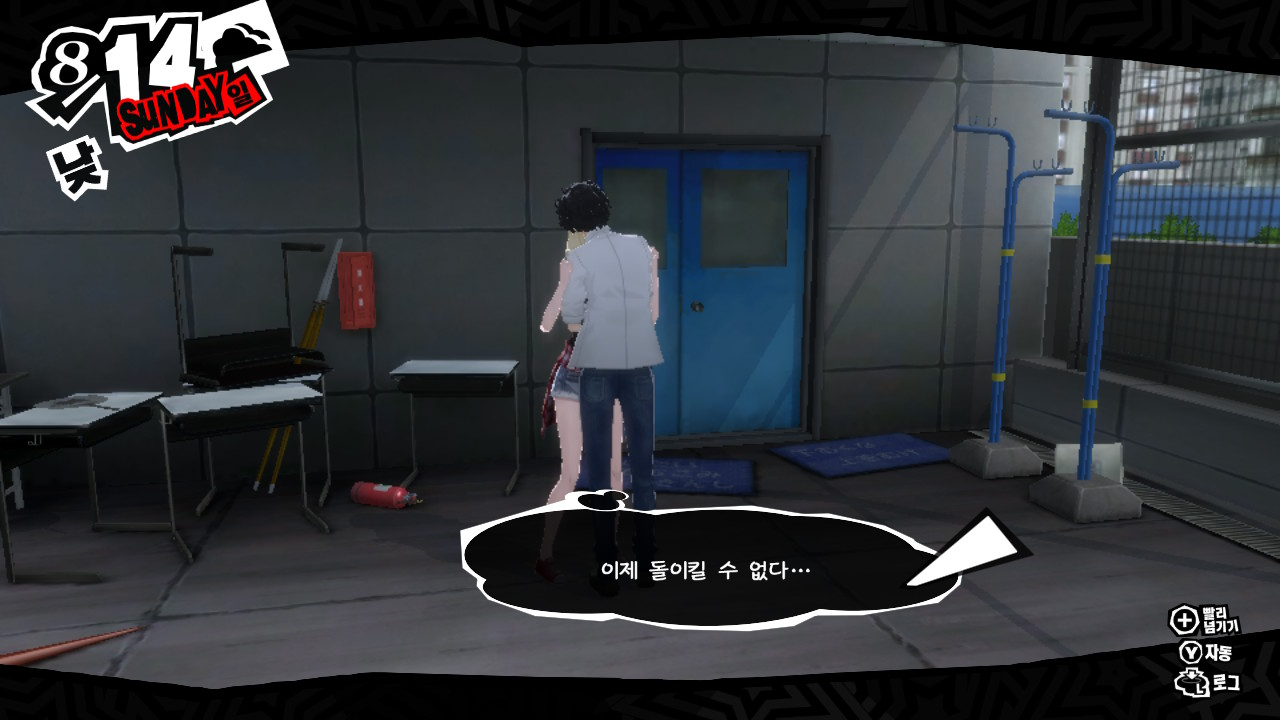 그러나 네 번째 팰리스 이후에는 다시 게임에 대한 동기가 급격히 떨어졌습니다. 네 번째 팰리스까지 쭉 달려 체력적으로 지친 상태에서, 매력적으로 느꼈던 '후타바' 캐릭터의 팰리스 서사가 어느 정도 마무리된 듯 한 와중에, 의도치 않게 외국 살다 온 여자애 캐릭터와 연인 관계가 확정되어버렸기 때문입니다. 연애 시뮬레이터처럼 게임을 즐길 생각이 없었고, 설령 연애 시뮬레이터처럼 게임을 즐길 생각이 들어도 굳이 그 외국 살다 온 여자애의 추가 이벤트를 보고 싶다는 생각은 들지 않았습니다. 곧바로 “이제는 돌이킬 수 없다”라는 충격적인 텍스트가 재생되었고, 그렇게 저는 동기가 사그라든 상태에서 게임의 흐름 마저 미연시라는 딱히 마음에 들지 않는 방향으로 빠져버려 게임을 접게 되었습니다.