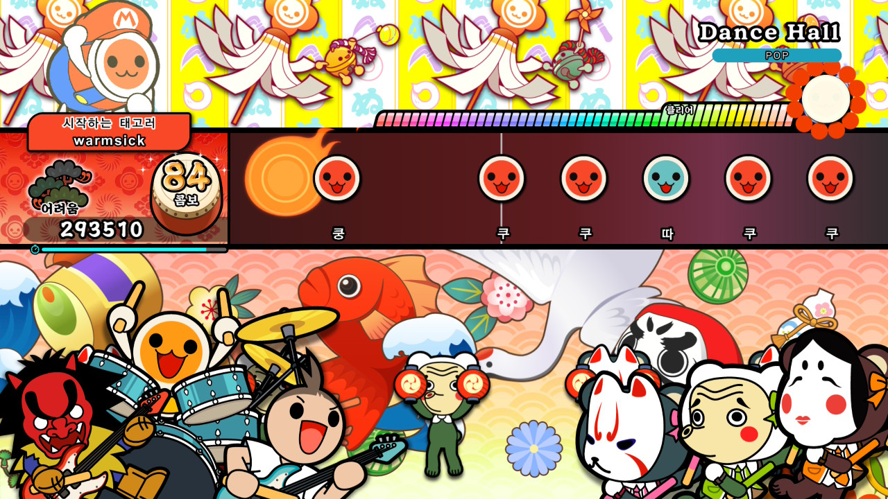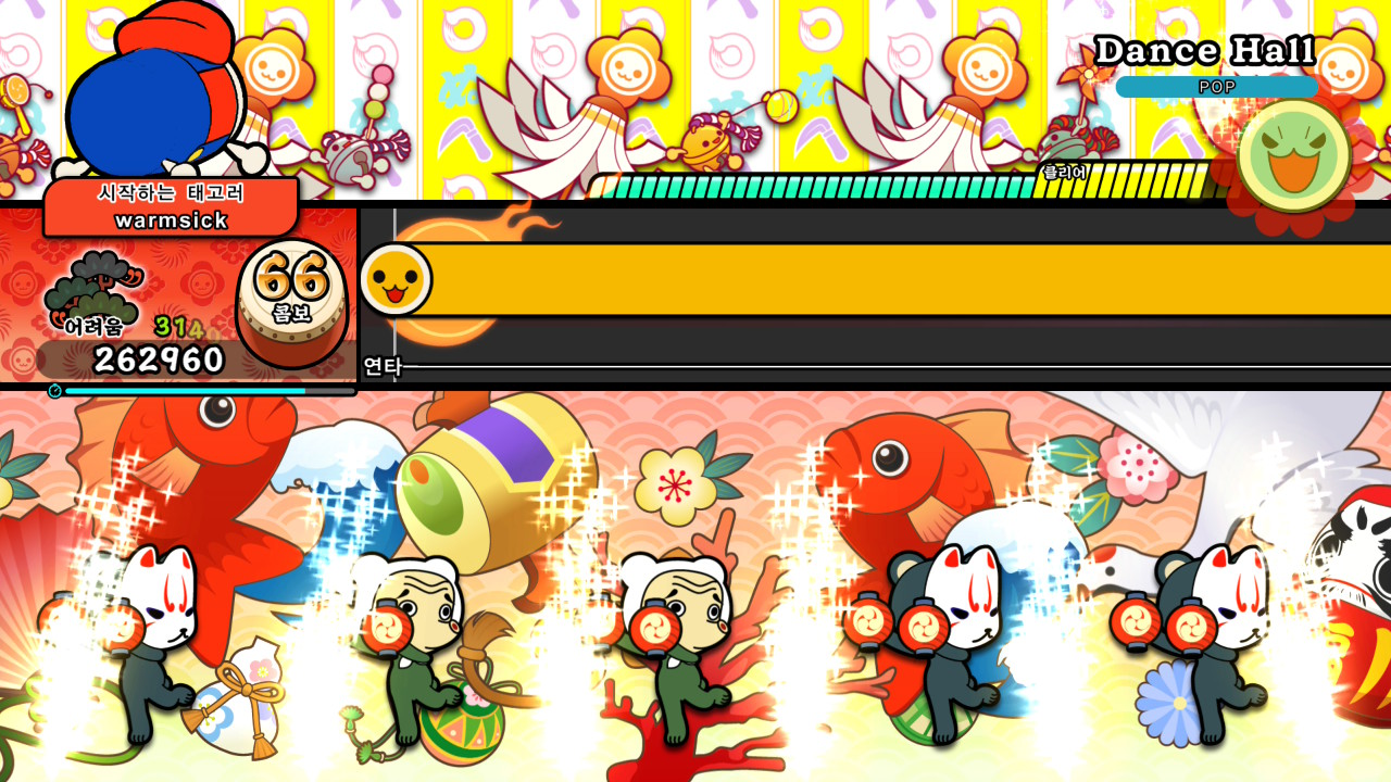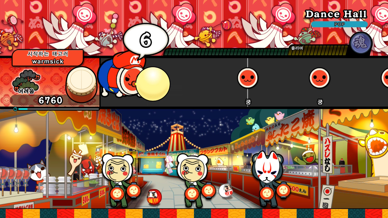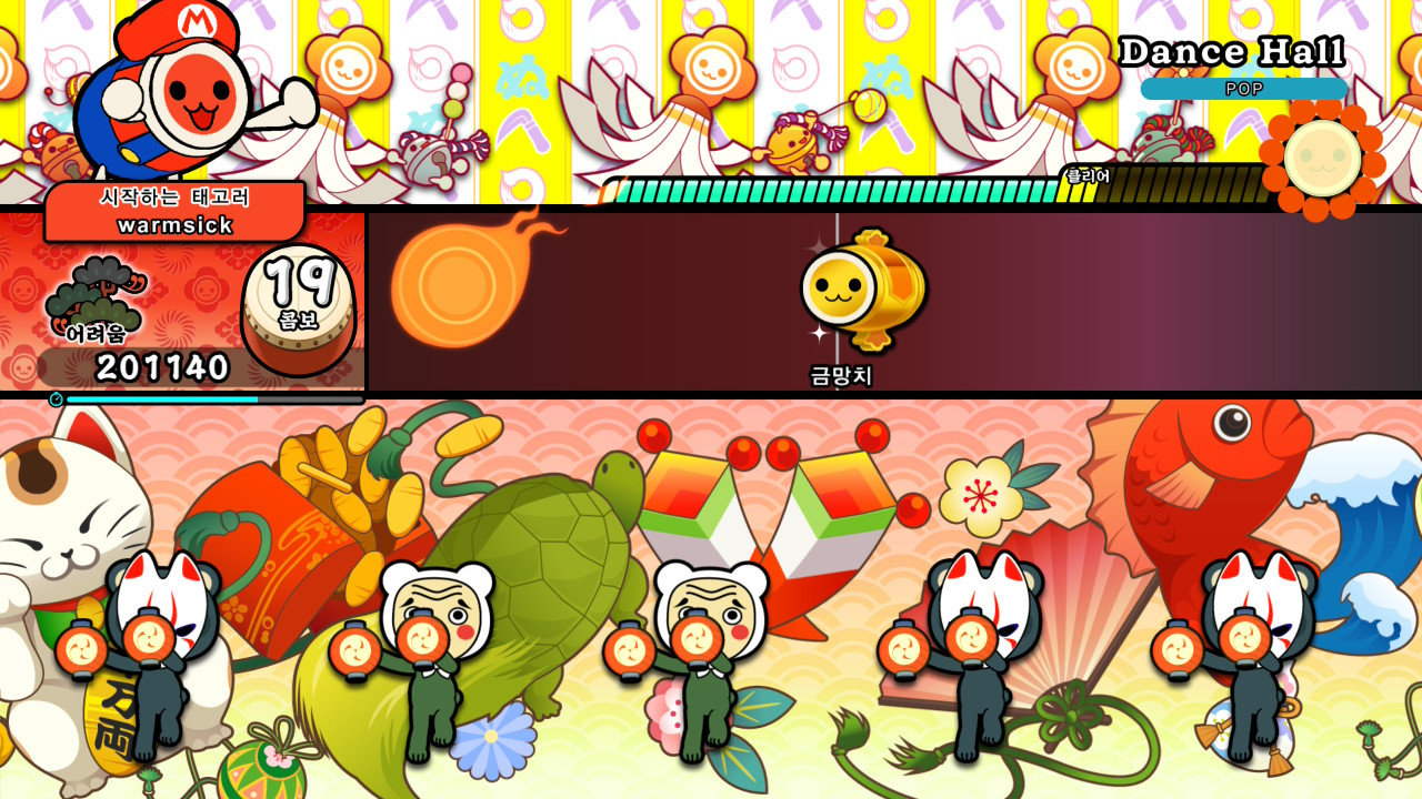 '태고의 달인'에서 곡의 클리어 조건은 노트를 정확하게 입력해 게이지를 쌓고, 그 수치를 일정 수준 이상으로 끌어올리는 것입니다. 그런데 '태고의 달인'은 이 게이지의 상승을 단순한 수치 변화로만 보여 주지 않습니다. 게이지가 차오를수록 배경에는 관중에 대응하는 캐릭터들이 하나둘씩 등장해, 곡을 함께 즐기는 모습을 보여 줍니다.