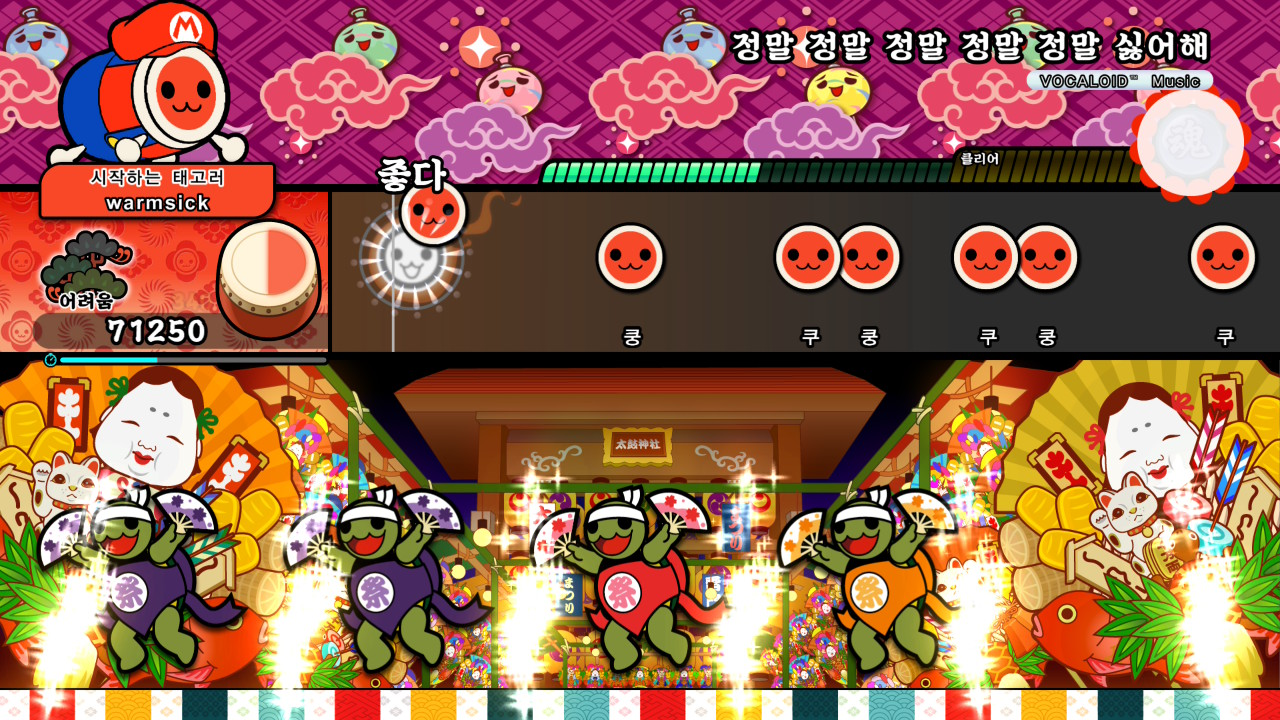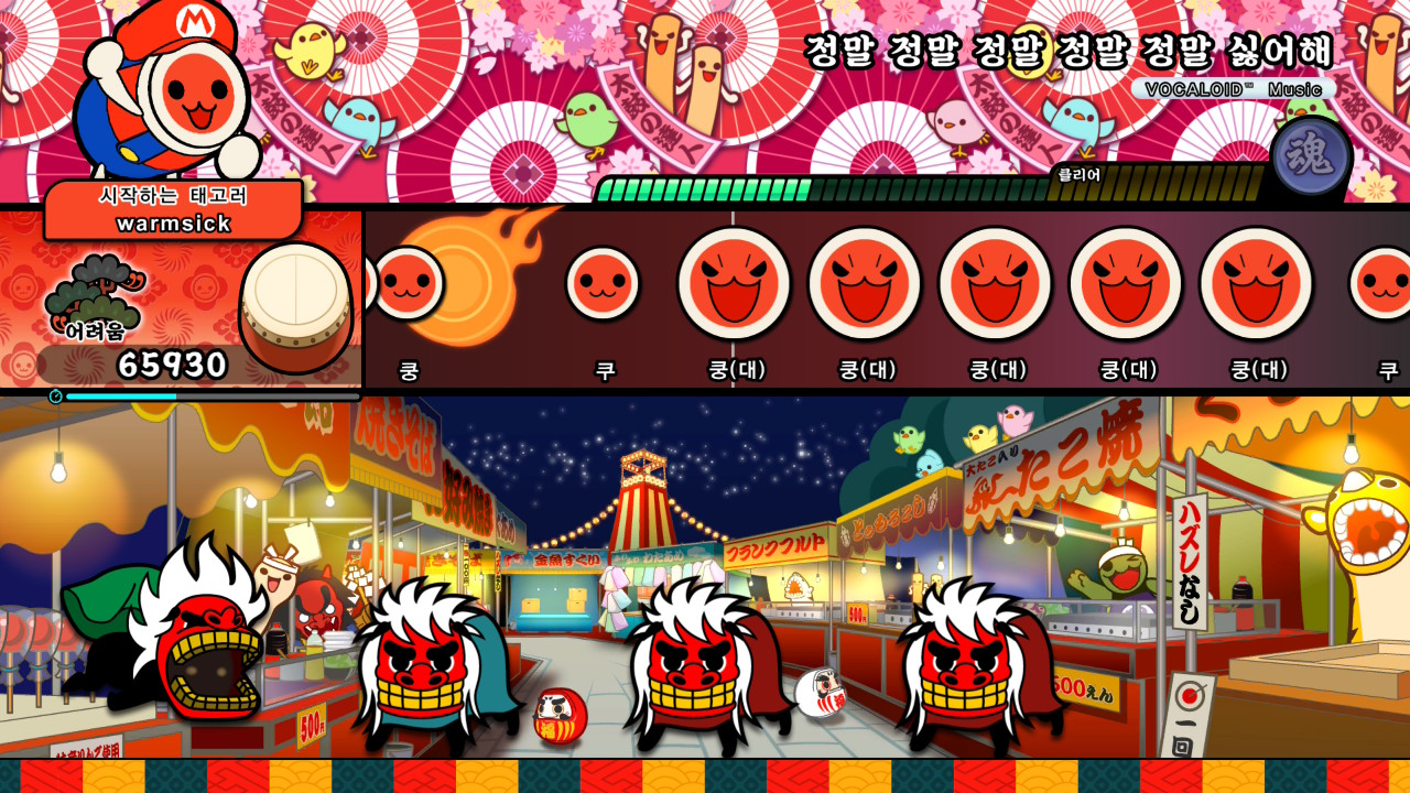 저는 특히 (대) 노트가 연속해서 등장하는 구간에서 더 큰 재미를 느꼈습니다. (대) 노트는 양손으로 북을 세게 치는 동작을 형상화한 조작인데, 일반 노트보다 크기가 더 크고, 입력 시 컨트롤러에 진동 효과까지 더해진다는 점이 이를 더욱 강조합니다.